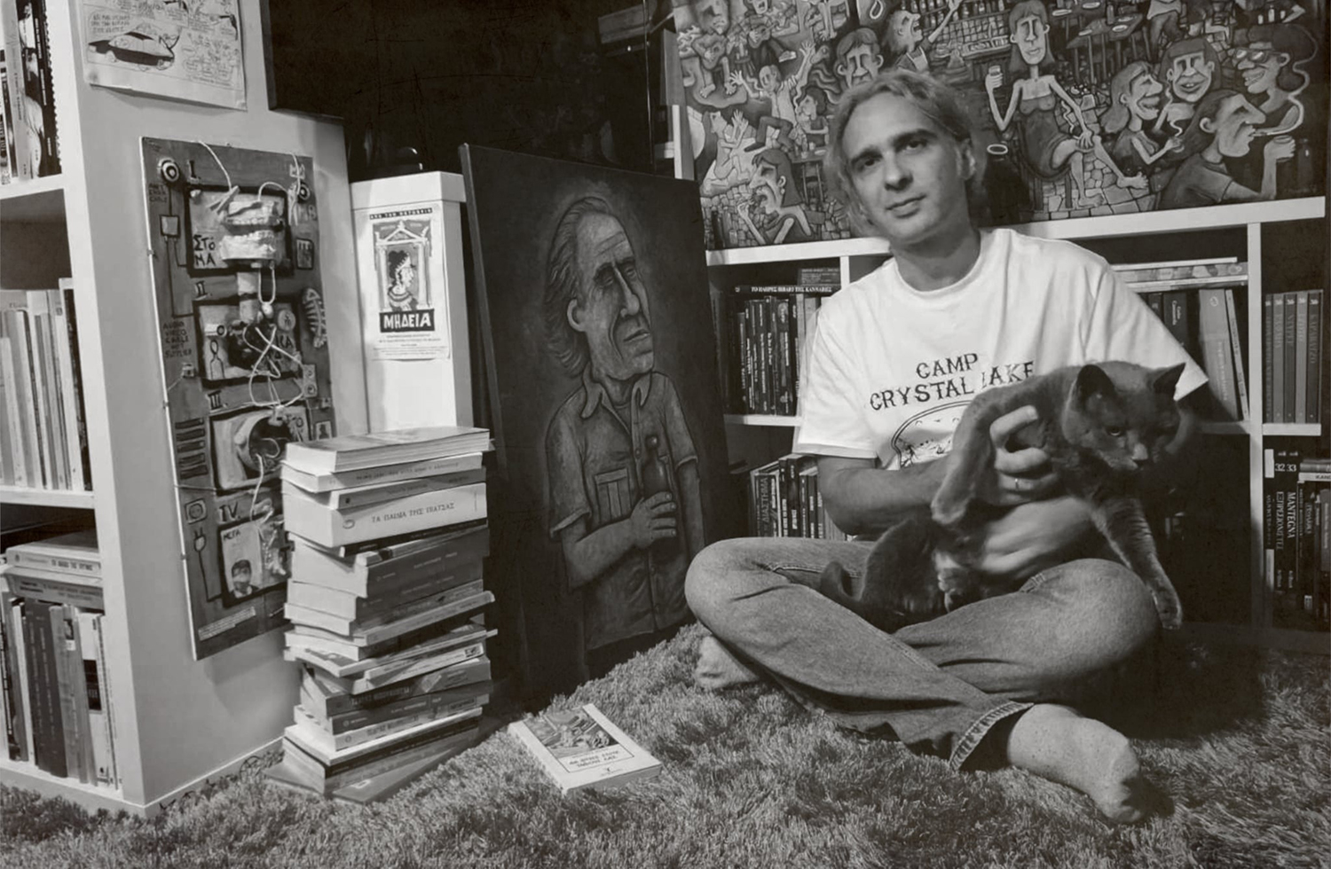 Τα βασικά εργαλεία είναι: δυο κουταλιές στιγμιαίος καφές, νερό και ελάχιστο γάλα. Κουταλάτος πάντα. Απαραίτητη είναι και η μουσική. Τελευταία βάζω Townes Van Zandt ή Tom Waits. Μετά πέφτω με τα μούτρα στα πρωτοσέλιδα και τις ειδήσεις, από συστημικά κυρίως ειδησεογραφικά μέσα. Με βοηθάνε περισσότερο να σκαρώσω στο κεφάλι μου το σκίτσο. Μετά πρέπει να το μεταφέρω στο χαρτί. Τα καθημερινά μου σκίτσα, όλα αυτά τα χρόνια, τα φτιάχνω σε ένα ημερολόγιο. Το σχέδιο πάντα στο χέρι και ίσως προσθέσω χρώμα στον υπολογιστή μετά το σκανάρισμα με ένα απλό πρόγραμμα. Τα πρώτα χρόνια που τα σκίτσα μου ήταν πιο χύμα, χρησιμοποιούσα παιδικούς μαρκαδόρους, ακόμα και κολλάζ. Στη ζωγραφική από την άλλη είναι πιο απλή η διαδικασία γιατί αυτό που θα φτιάξω είναι ήδη κάπου μέσα στο κεφάλι μου. Αρκεί μια οποιαδήποτε επιφάνεια. Τελευταία τη βάφω πρώτα μαύρη και μέσα απ’ τη μαυρίλα γεννιούνται χρώματα, φιγούρες και ό,τι άλλο. Απελευθερώθηκα δημιουργικά όταν άρχισα να χρησιμοποιώ πιο ευτελή μέσα. Συνήθως ζωγραφίζω με φτηνά λάδια πάνω σε χαρτί, σχεδίου, ακουαρέλας ακόμα και σε απλό Α4 ή σε σελίδες περιοδικών.