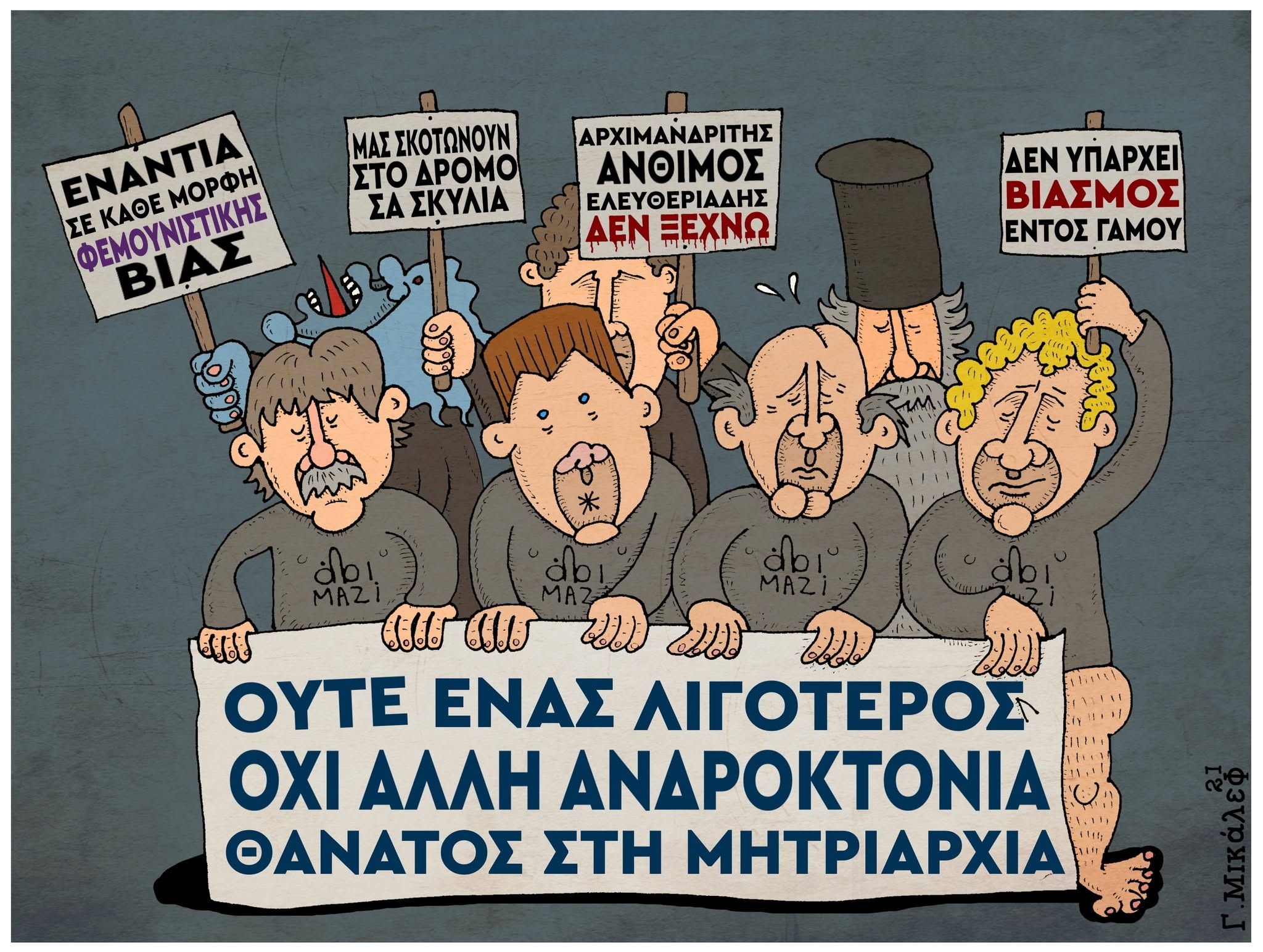 Το αθάνατο τρίπτυχο – πατρίς – θρησκεία- οικογένεια είναι το αγαπημένο μου. Η ελληνική κοινωνία είναι τόσο αρρωστημένα συντηρητική που αναρωτιέσαι αν όλοι αυτοί οι απόγονοι ηρώων έχουν κάποιο θέμα γονιδιακό. Και να μην ξεχνάμε πως το Ελληνικό DNA είναι πεντακάθαρο και αναλλοίωτο σε σχέση με των ξένων. Είναι σαν να τσακώνονται δύο κουράδες και να κομπάζει η μία στην άλλη πως είναι ανώτερη επειδή εκείνη εξήλθε από ηρωική οπή. Γίνομαι ακραίος γιατί αφενός σιχαίνομαι τον καθωσπρεπισμό και αφετέρου είναι τόσο ακραία αυτά που ζούμε, που η πραγματικότητα ξεπερνάει την φαντασία. Η εγκληματική οργάνωση που μας κυβερνάει αγκαλιάζει αυτό το τρίπτυχο χωρίς να το κρύβει. Το τραγουδάει μάλιστα και στον ύμνο της ενώ παράλληλα έχει στο δυναμικό της ακροδεξιά στοιχεία που ούτε αυτά κρύβουν τις ακραίες και χουντικές απόψεις τους. Να προσθέσω βέβαια πως προσφέρει και άφθονο υλικό για σάτιρα. Στον λαό δεν θα λείψει αυτή η κυβέρνηση όταν θα πάει στο διάολο αλλά πιστεύω πως στους σκιτσογράφους θα λείψει πολύ.