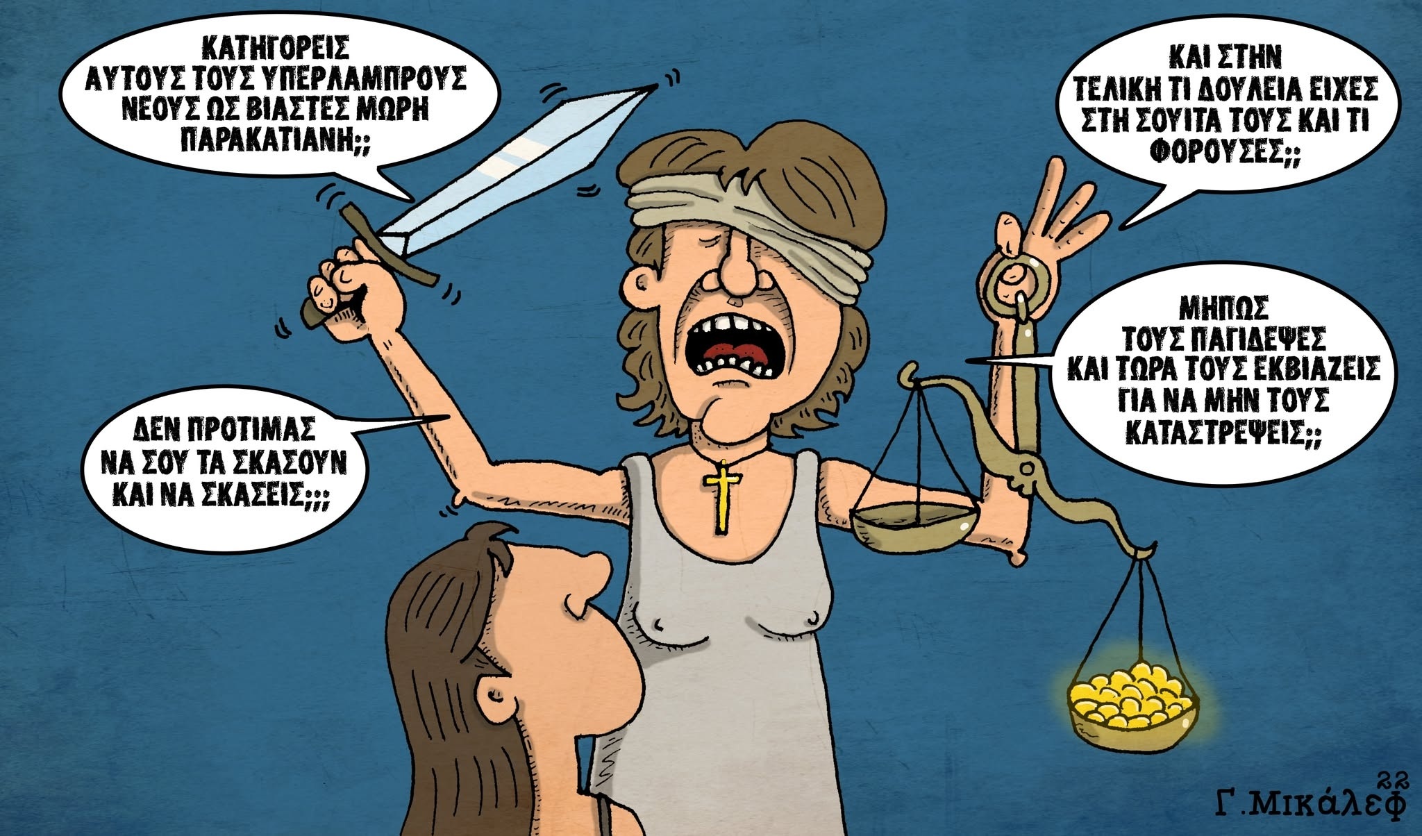Έχεις υποστεί διώξεις από κατεστημένες δυνάμεις για το έργο σου, σου έχουν λογοκρίνει σκίτσα, αλλά δεν φαίνεται να μασάς. Με όλα αυτά τα τραγικά και τραγελαφικά που συμβαίνουν, ποια είναι η άποψή σου για τη δικαιοσύνη;