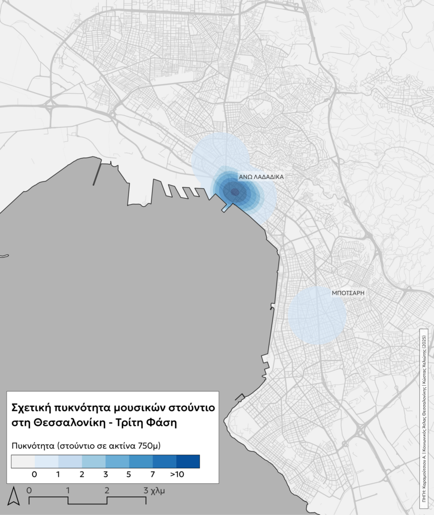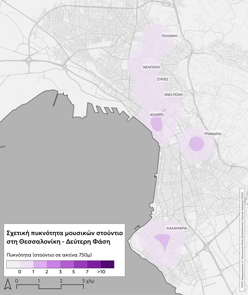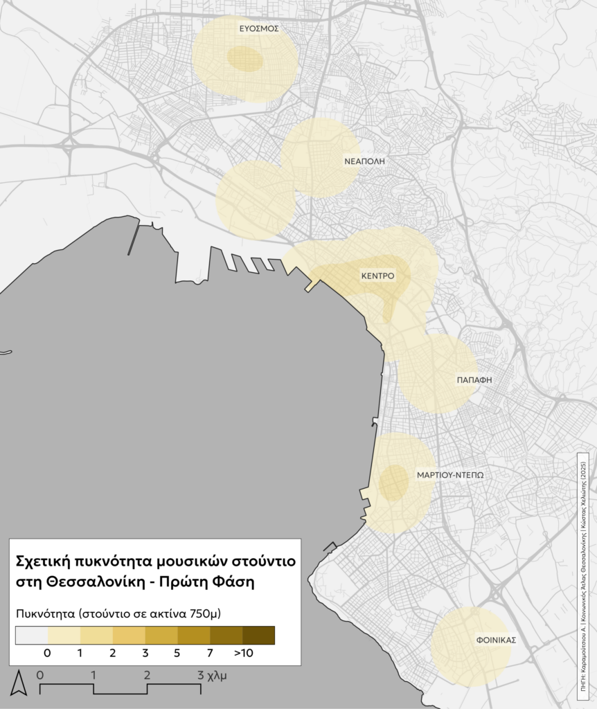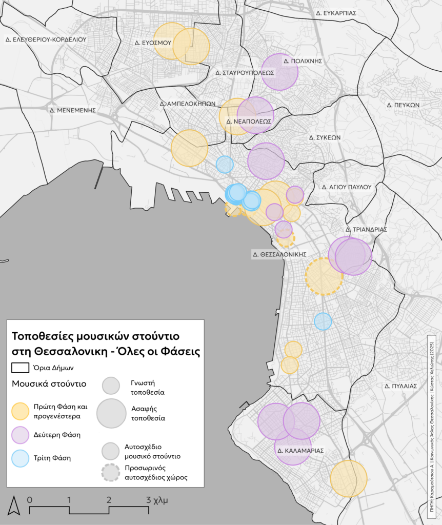 Η χαρτογράφηση των Αυτοσχέδιων Μουσικών Στούντιο σε τρεις φάσεις αποκαλύπτει τη μεταβαλλόμενη γεωγραφία τους: από τη διάσπαρτη παρουσία τους σε ένα ευρύ πολεοδομικό φάσμα στα μέσα του ’70, στην εμφάνισή τους σε Καλαμαριά, Νεάπολη, Άνω Πόλη και κέντρο, τη δεκαετία του ’80, και, τελικά, στη συγκέντρωση και εδραίωσή τους στο δυτικό κέντρο στα τέλη της ίδιας δεκαετίας. Οι χωρικές αυτές μετατοπίσεις φωτίζουν τους τρόπους με τους οποίους οι μουσικοί αξιοποίησαν τον αστικό χώρο για να συγκροτήσουν δίκτυα, κοινότητες και νέες μορφές πολιτισμικής δράσης, ενώ αναδεικνύουν σημαντικές πτυχές της αστικής κουλτούρας της Θεσσαλονίκης.