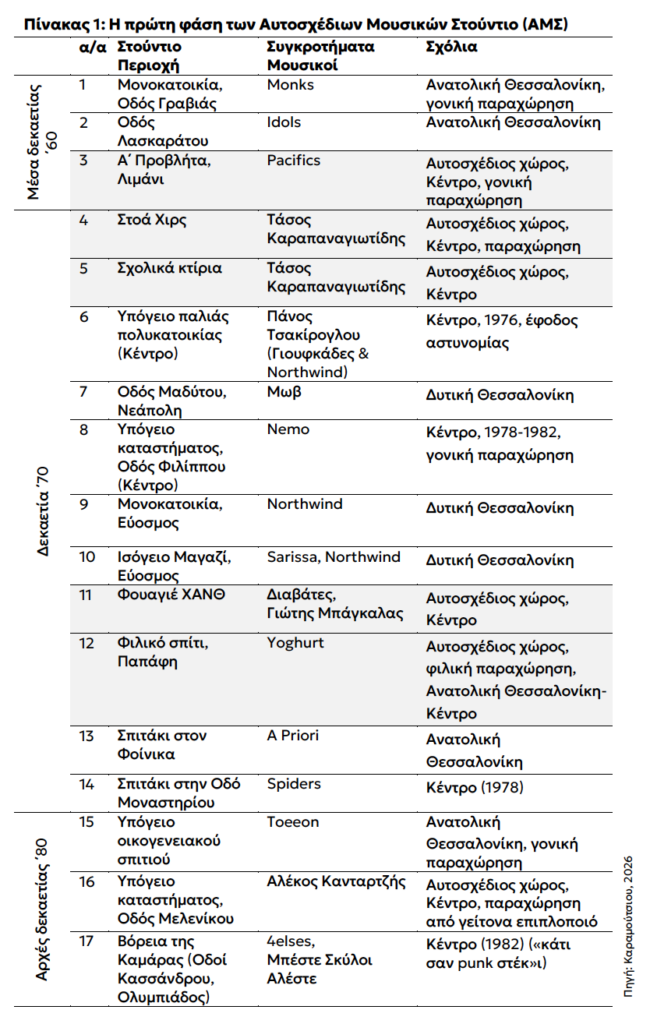 Μία από τις πρώτες προσπάθειές στησίματος ΑΜΣ στο κέντρο ήταν αυτή των Nemo, στην οδό Φιλίππου, κάτω από το παπλωματάδικο του πατέρα του Τσαφαρίδη, κιθαρίστα του σχήματος (Συνέντευξη 20). Το συνεχές πρόβλημα της όχλησης οδήγησε σε πιο συστηματική χρήση αυτοσχέδιων τεχνικών ηχομόνωσης (αυγοθήκες, μοκέτες, φελιζόλ) και στην αναζήτηση απομονωμένων, φθηνών, εγκαταλελειμμένων χώρων σε περιοχές εκτός κατοικημένου ιστού (Αγγελάκας 2016; Παπαδόπουλος 2017; Συνέντευξη 10). Οι μαρτυρίες αναφέρουν χώρους χωρίς φως, νερό ή στοιχειώδεις υποδομές, με ιδιοκτήτες που προτιμούσαν να τους νοικιάζουν φτηνά σε νέους μουσικούς (Συνέντευξη 6, 14). Ενδεικτικά, οι A Priori νοίκιασαν ένα απομονωμένο σπίτι στον Φοίνικα το 1977 (Συνέντευξη 20), οι Northwind και οι Sarissa χρησιμοποίησαν το ισόγειο μαγαζί ενός κτιρίου στον Εύοσμο, οι Spiders ένα σπίτι δίπλα στις γραμμές του τρένου (Συνέντευξη 11), οι ΣΥΧΑΜΑ και οι The Mushrooms μονοκατοικίες στην Τριανδρία (Συνέντευξη 21; Μίχος, 2019). Τέλος, στη Νεάπολη, ήδη από τα τέλη του ’70, υπήρχαν σταθερότεροι χώροι, όπως το στούντιο των Μωβ στην οδό Μαδύτου (Συνέντευξη 16). Στον Πίνακα 1 παρουσιάζονται συγκεντρωτικά τα στούντιο της πρώτης φάσης, οι περιοχές τους και τα συγκροτήματα που τα χρησιμοποίησαν. Από τα 14 συνολικά ευρήματα, τα 9 αντιστοιχούν σε ΑΜΣ και τα 5 σε πιο προσωρινούς, αυτοσχέδιους χώρους (γκρι υπογράμμιση).