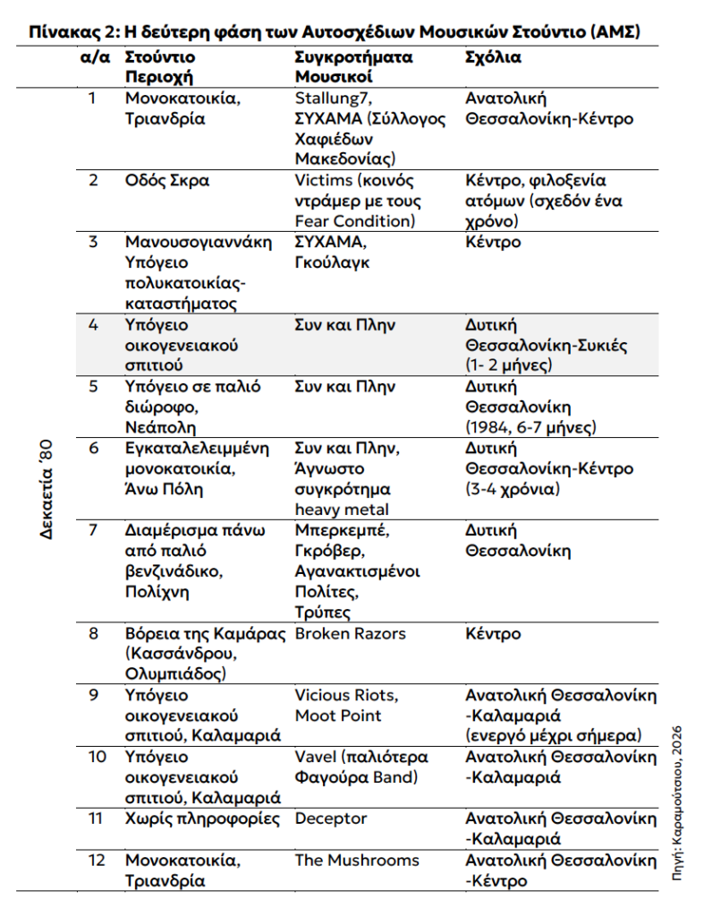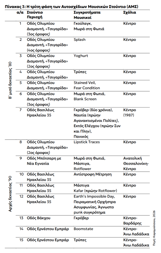 Η εξέλιξη της πρακτικής των ΑΜΣ, από τα μέσα της δεκαετίας του ’70 έως τις αρχές του ’90, διακρίνεται σε τρεις φάσεις (Εικόνα 3). Η πρώτη φάση (μέσα ’70) χαρακτηρίζεται από σποραδική παρουσία των ΑΜΣ και τη συνύπαρξή τους με αυτοσχέδιους χώρους προβών, διάσπαρτους από τον Εύοσμο έως τον Φοίνικα, με ορισμένες προσπάθειες και στο κέντρο. Η δεύτερη φάση (βασικός κορμός δεκαετίας ’80) σηματοδοτεί την καθιέρωση της πρακτικής ως συνήθειας για όσους επιθυμούσαν να παίξουν τη δική τους μουσική, με στούντιο να εμφανίζονται στην Καλαμαριά και τη Νεάπολη. Η τρίτη φάση, από τα τέλη της δεκαετίας του ’80 έως τις αρχές του ’90, παρουσιάζει δύο νέα χαρακτηριστικά: τη μεταφορά των περισσότερων στούντιο στο κέντρο και τη συγκέντρωσή τους σε συγκεκριμένα κτίρια, που μετατρέπονται σε κόμβους μουσικής κοινωνικότητας. Η γειτνίαση των μουσικών και η εγγύτητα με τα στέκια του κέντρου συνέβαλαν στην άνθηση του DIY δικτύου (Karamoutsiou 2022). Η πρακτική μετατροπής ολόκληρων κτιρίων σε χώρους ΑΜΣ, με επίκεντρο τα Άνω Λαδάδικα, παραμένει ζωντανή έως σήμερα τροφοδοτώντας συνεχώς τη μουσική ζωή της πόλης και όλης της χώρας με πρωτότυπες μουσικές δημιουργίες.